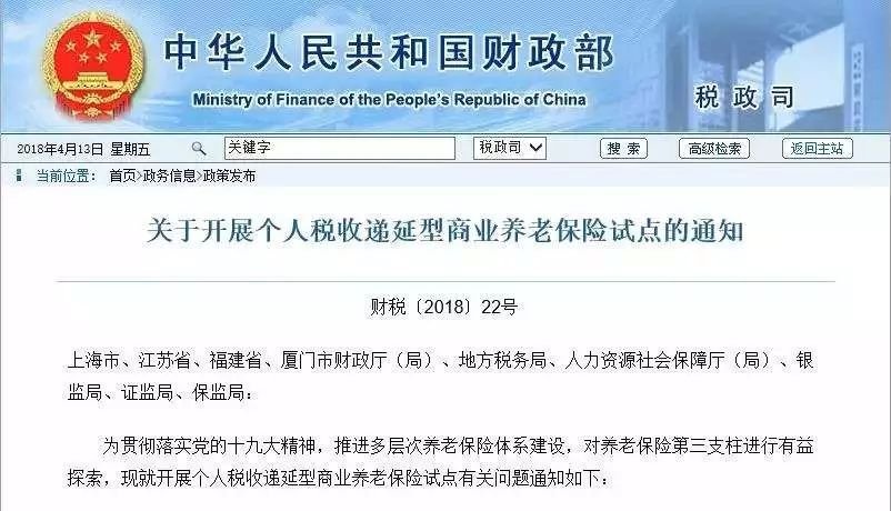 为贯彻落实党的十九大精神,推进多层次养老保险体系建设,对养老保险第三支柱进行有益探索,现就开展个人税收递延型商业养老保险试点有关问题通知如下: