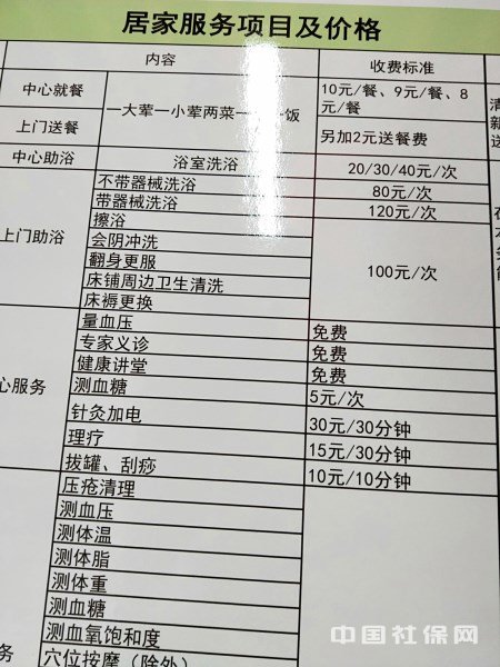 居家养老服务中心墙上的价目表。