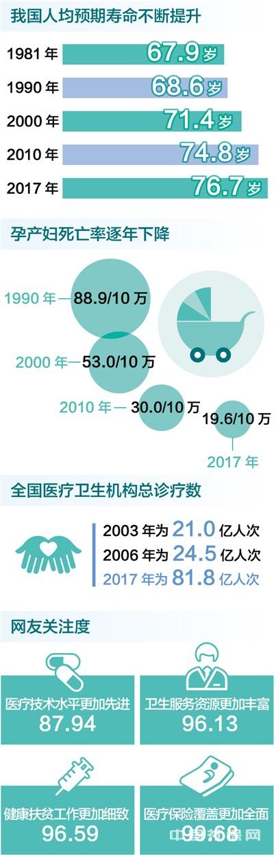 我国人均预期寿命不断提升。1981年为67.9岁,2000年为71.4岁,2017年为76.7岁。婴儿死亡率和孕产妇死亡率持续下降,分别从1990年的32.9‰和88.9/10万,下降为2017年的6.8‰和19.6/10万。
