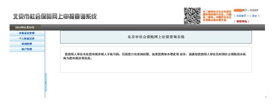 (3)登录后,如所在单位没有为参保人申报手机号,系统会给出提示,此时参保人只能查询个人有关信息,不能进入“申报业务管理”选择获取对账单方式。如希望通过个人用户登录选择获取对账单方式,参保人需通过用人单位向社保申报本人有效的手机号码,经与参保人注册登录时使用的手机号码校验一致的,参保人即可个人自助选择获取对账单方式。