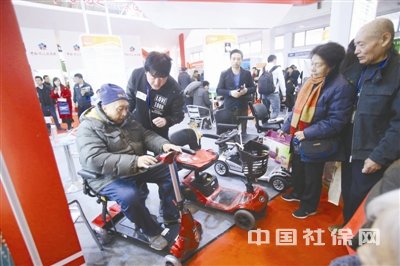 一位老年参观者在北京举行的养老产业博览会上体验老年代步车。陈晓根 摄/中新社
