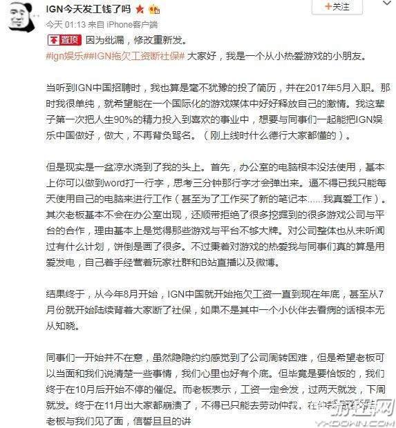 爆料称,IGN中国可能出现了资金周转困难,但并未向员工透露任何消息,也没有展开任何裁员计划。在催促无果之后,该公司员工在11月发起了劳动仲裁,仲裁书递交后,老板出面称“公司最晚11月30日能发,社保也可以补上”,但至今承诺仍未兑现。