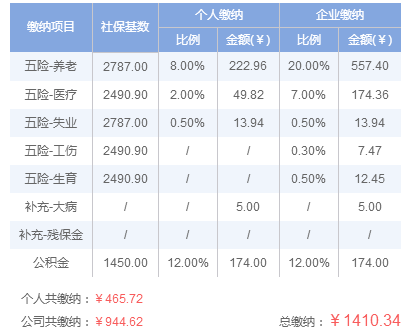 个人五险一金最低缴费金额=222.96+49.82+13.94+5+174=465.72元