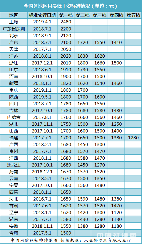 上海人社局此前公布消息,从2019年4月1日起,上海市职工月最低工资标准从2420元调整为2480元。此次上调额度为60元,较往年的一二百元的标准下降不少。