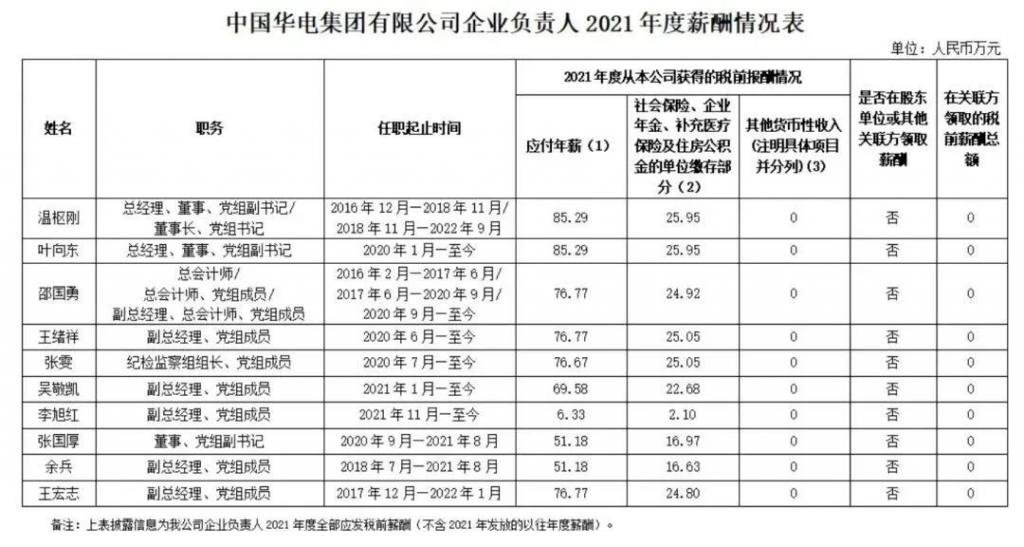 1 月 30 日,中国华电集团公布企业负责人 2021 年度薪酬情况表。中国华电董事长、党组书记温枢刚年薪 85.29 万元。