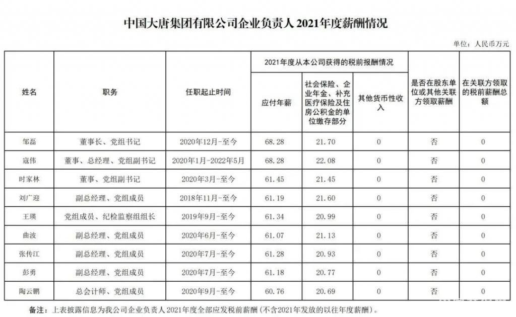 1 月 29 日,中国大唐集团有限公司披露企业负责人 2021 年度薪酬情况。大唐集团董事长、党组书记邹磊年薪 68.28 万元。
