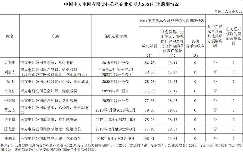 1 月 30 日,中国南方电网有限责任公司披露企业负责人 2021 年度薪酬情况。南方电网董事长、党组书记孟振平年薪 86.73 万元。