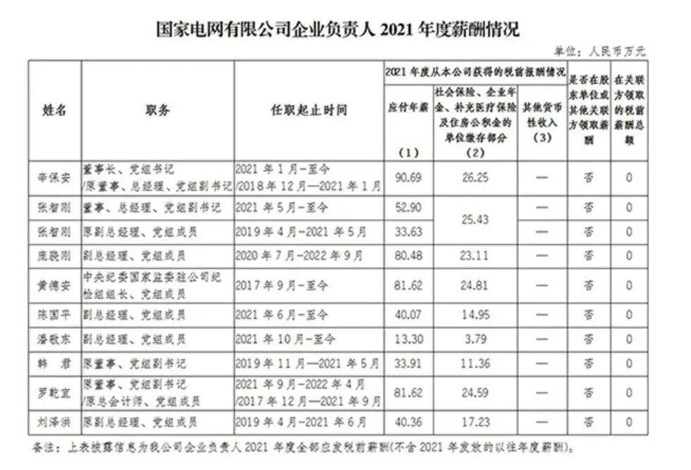 2023 年 1 月 29 日,国家电网在网站公布企业负责人薪酬信息。国家电网有限公司董事长、党组书记辛保安,年薪 90.69 万元。
