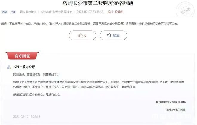 “已有一套房,户籍在长沙(省内迁入)想获得第二套购房资格,需要买缴纳社保吗?”近日,在问政平台上,长沙市住建局答复称,将唯一商品住房供作租赁住房的,不受落户等限制,允许再购买一套商品住房。