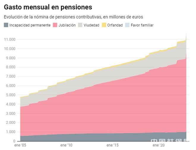 综合《机密报》《阿贝赛报》报道,根据社保部今日公布的数据,西班牙每个月在社保方面的支出要比去年多11亿欧元,仅缴费型社保金(不包括非缴费型社保金或被动类)一年的额外支出超过150亿欧元。这笔支出的大部分将用于支付退休金,2月份的退休金支出接近87亿欧元,比去年多12%。