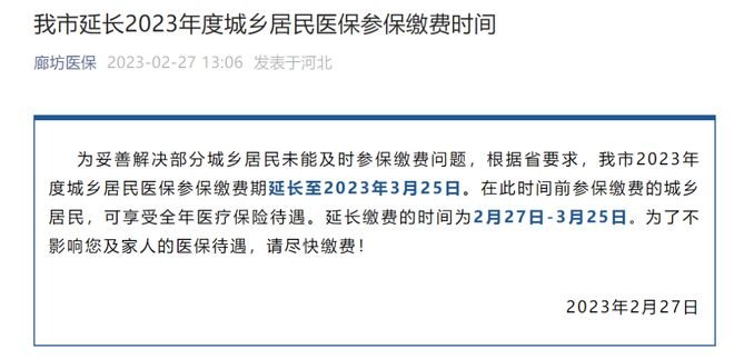 为妥善解决部分城乡居民未能及时参保缴费问题,根据省要求,我市2023年度城乡居民医保参保缴费期延长至2023年3月25日。在此时间前参保缴费的城乡居民,可享受全年医疗保险待遇。延长缴费的时间为2月27日-3月25日。为了不影响您及家人的医保待遇,请尽快缴费!