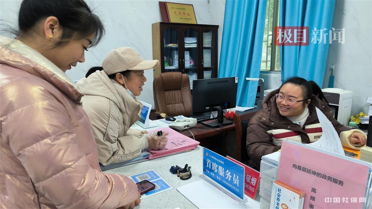 12月12日,黄梅县蔡山镇人社中心首席服务员为群众办理社保业务