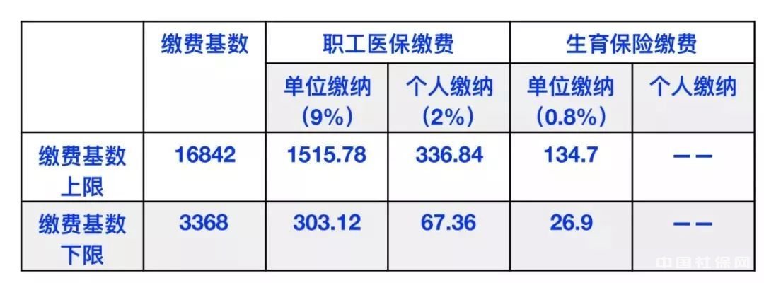 2019年7月1日至2020年6月30日,职工医疗保险、生育保险缴费基数上限为16842元,相比上年减少了3093元,缴费基数下限为3368元,相比上年增加了243元。