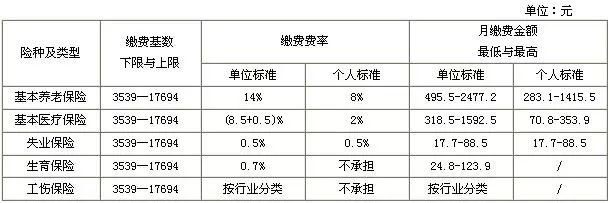 参保单位2019年度社会保险个人缴费基数上限为17694元、下限为3539元。个体工商户、个体劳动者(含灵活就业人员)的个人缴费基数上下限另行发布。