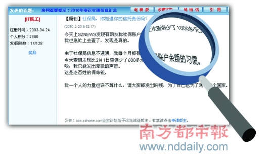 摘要:昨天上午,一则网帖激起千层浪,发帖人称上网查询自己的社保账户,赫然发现账面金额减少了1000多元。网友纷纷查询账户,不少跟帖称个人养老账户金额比月初减少了数十元甚至上千元,有网友把矛头对准了深圳市人力资源和社会保障局(下称市社保局),认为是后者在捣鬼,要求其作出解释。