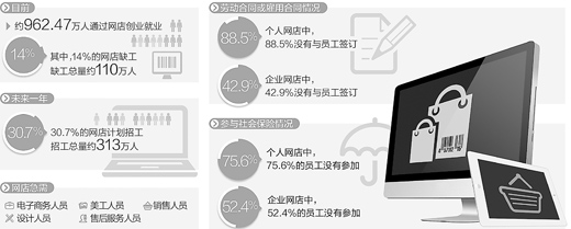 此次调查的数据显示,962.47万人通过网店直接就业,网店缺工总量约为110万人,网店吸纳就业的潜力不小。
