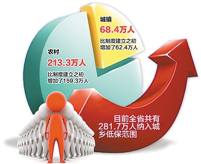 据统计,目前全省共有281.7万人纳入城乡低保范围,其中城镇低保对象68.4万人,农村低保对象213.3万人,分别比制度建立之初增加了62.4万人和159.3万人。如今,城镇低保标准已达到413元/月,农村达到2454元/年。全省城乡低保的人均补差水平,城镇达到了235.9元/月,农村达到了117元/月。 (陈诚 李鑫)