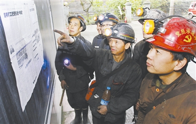 矿工在报栏前阅读《工人日报》的报道。张登泽 摄