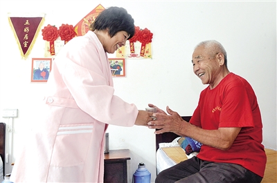 山东寿光福利中心服务员为崔海滨老人喂药。