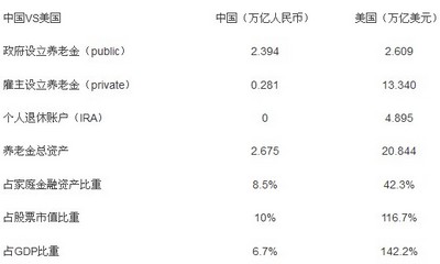 与美国相比,中国养老金市场规模明显偏小,国民的养老储备明显不足。截止2010年底,中国养老金总资产只有2.675万亿元人民币,仅相当于美国养老金总规模的1/50,而美国的GDP只有中国GDP的2.35倍。尽管中国的GDP已是世界第二大经济体,仅次于美国,但在GDP竞争差距不断缩小的外表下,中美之间的养老金市场规模的相对差距却正在扩大。