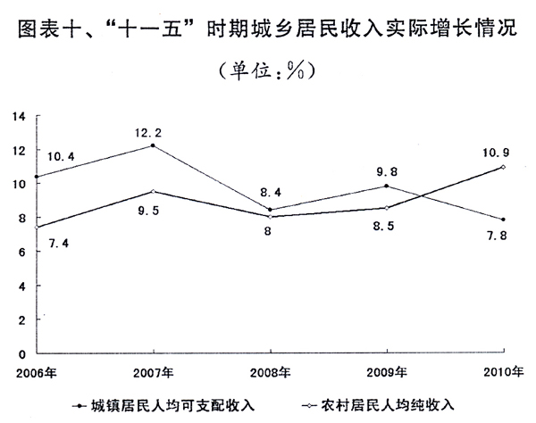 图表十:“十一五”时期城乡居民收入实际增长情况 新华社发