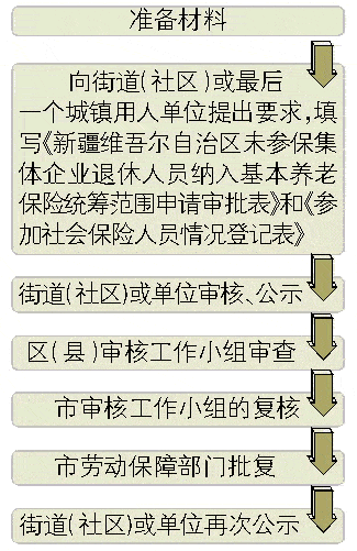 根据流程要求,现在,乌鲁木齐符合条件的城镇未参保集体企业退休人员,最后一个城镇用人单位仍然存在的,由最后一个用人单位办理登记手续;最后一个城镇用人单位已不存在或拒绝为其办理登记手续的,可到现居住地街道(社区)办理受理登记手续。