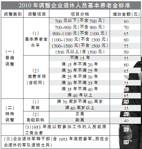 按基本养老金水平调整,对700元以下的增幅较大(达到80元),偏低群体的受益面大,体现了向基本养老金偏低群体的倾斜;按缴费年限调整,照顾了缴费年限长的增资,同时,加大了按缴费年限增加的比重,有利于鼓励缴费。特殊调整,分别对年满70周岁以上的高龄人员、具有高级职称的企业退休科技人员、1953年底以前参加工作的人员、原工商业者、企业退休军转干部(含1953年底前参军,后在企业退休的军队退役士兵)进行倾斜。