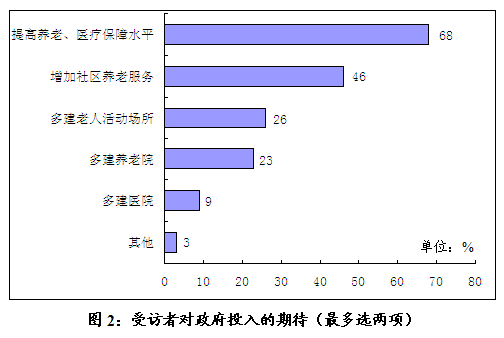 面对老龄化社会的到来,受访者对政府投入最期待的是“提高养老、医疗保障水平”,被选比例达68%;其次是“增加社区养老服务”,被选比例为46%;也有不少人期待“多建老人活动场所”和“多建养老院”,比例为26%和23%(见图2)。