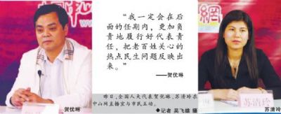 贺优琳:作为人大代表,我已经两次到北京开会了,最大的收获是收获了一份责任。没做代表前,根本没想到老百姓对"两会"如此关注。