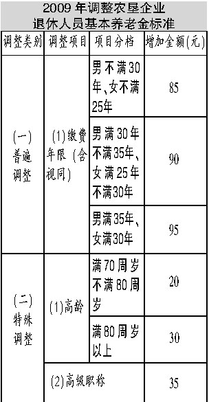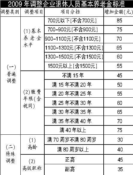 有关部门负责同志介绍,此次基本养老金调整,实行普遍调整与特殊调整相结合的办法。普遍调整中向基本养老金偏低群体倾斜,月基本养老金在700元以下的增幅较大,达到85元。在普遍调整的基础上再进行特殊调整,对象为企业退休高级职称人员和年满70周岁以上的高龄人员;同时符合高级职称和高龄倾斜政策的,调整时可合并累加计算。