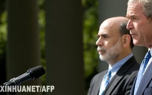 19日,在美国华盛顿白宫,美国总统布什(右)发表经济方面的讲话。旁边的是美联储主席伯南克。布什说,为了结束目前这场几十年来最严重的金融危机,联邦政府干预金融市场不仅有正当理由,而且必要。新华社/法新