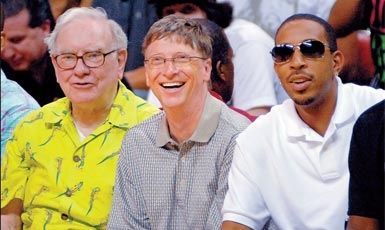 盖茨和股神巴菲特(左)、说唱歌手卢达克里斯(右)一起观看美国篮球队比赛