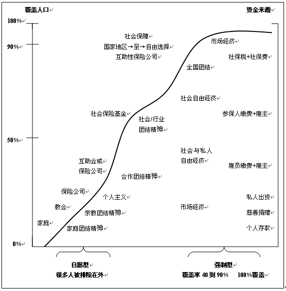 纵观世界各国福利制度发展史,他们几乎都走过了一条曲折攀升的道路。在组织形式上,福利制度的发展轨迹从低到高,其演进脉络是:家庭-→教会-→保险公司-→互助会-→社保金库→互助性保险制度-→社会保险等;这种组织形式的所体现的精神理念依次应该是:家庭团结-→宗教团结-→个人主义-→群体互助-→企业互助-→行业合作-→全国团结等;由此看出,福利制度的这个脉络大致经历了这样几个社会经济形态:自发经济-→私人自由经济-→社会自由经济-→现代市场经济等;在这个演进过程中,福利制度的覆盖面越来越大,并且逐渐从自愿型过渡到强制性的制度。