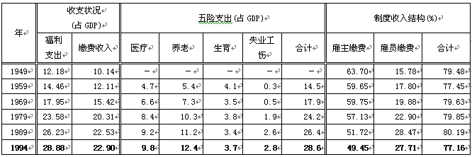 表1:1949-1994年法国社保制度总体收支(五险)占GDP比例及其与制度收支的关系