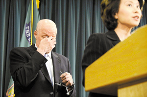 3月25日,美国财政部长保尔森(左)和美国劳工部长赵小兰在华盛顿出席新闻发布会。保尔森呼吁采取措施,改革社会保障项目和美国联邦医疗保险项目,尽快解决这两个福利项目面临的财政困难。根据美国财政部当日发布的年度预测报告,美国社保基金预计将在2041年以前用完,联邦医疗保险信托基金也将于2019年以前耗尽,这一预测与去年的报告持平。新华社发