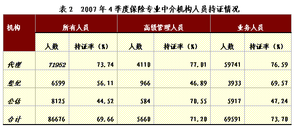 5.保险营销队伍整体实力增强。截至2007年12月31日,全国保险营销员数量首次突破200万人,创下历史新高。同时,营销员的持证率继续保持在99%以上。本年度,全国营销员渠道共实现保费收入3193.9亿元,同比增长20.48%。随着营销实力的增强,各保险公司更加重视保险营销员队伍,加大了投入,全年共支付佣金444.15亿元,同比增长了46.91%。