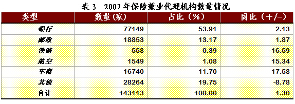 截至2007年12月底,全国共有保险兼业代理机构143113家,比2006年末增加1835家。