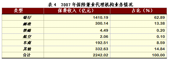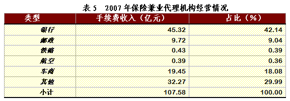 2007年,保险兼业代理机构实现代理手续费收入107.58亿元,同比增长47.86% 。