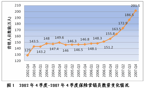 截至2007年12月底,全国共有保险营销员2014900 人,比2006年增加456811人,增长29.32%。其中,寿险营销员1767024人,增长28.42%;产险营销员247876人,增长36.1%。