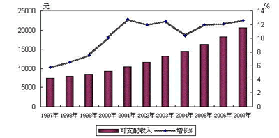 2007年,浙江城镇居民人均可支配收入达到20574元,同比增长12.6%,扣除价格上涨因素,实际增长8.4%。人均可支配收入的名义增长继续保持了2000年以来10%以上的增幅,居民的收入来源日益多元化,生活水平不断提高。