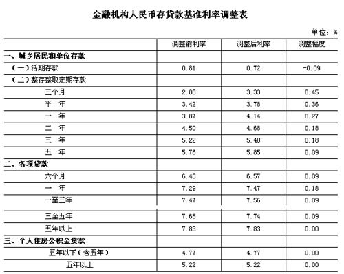 为贯彻从紧的货币政策,中国人民银行决定:从2007年12月21日起调整金融机构人民币存贷款基准利率,一年期存款基准利率由现行的3.87%提高到4.14%,上调0.27个百分点;一年期贷款基准利率由现行的7.29%提高到7.47%,上调0.18个百分点;其他各档次存、贷款基准利率相应调整。个人住房公积金贷款利率保持不变(具体水平见附表)。此次调整有利于防止经济增长由偏快转为过热,防止物价由结构性上涨演变为明显的通货膨胀。