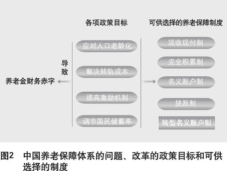 政府和理论界都在积极的寻求能够解决或至少缓解现有问题的方案。根据中国养老保险体系目前存在的问题的情况,任何成功方案的设计都必须要能够同时的处理好(1)人口老龄化;(2) 转轨成本;(3) 激励机制;以及(4)养老保险改革对国民储蓄率的影响这几个问题。图2总结了中国养老保障体制改革的政策目标和可供选择的制度,其中转型名义账户制正是本文所要设计和倡导的创新制度。