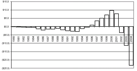 资料来源: “PBGC Net Position Single-Employer Program FY 1980-FY2004.” www.pbgc.gov