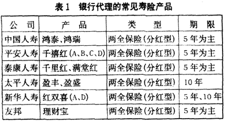 我国银行代理销售的保险产品主要是意外伤害保险、家庭财产保险和低保障、侧重储蓄和投资的寿险产品。这些险种设计简单、产品同质化程度较高。高同质化又导致风险与日俱增。以寿险公司为例:银行保险产品基本上是五年期以上的储蓄型替代产品,其中又以短期趸缴分红险种为主。从表1可以看出。各种寿险公司的银行代理产品虽然名称各异,但基本上都为期限较短的趸缴型分红产品。这类保险产品大多结构简单、手续简便,适合于临柜销售。有利于保险公司在短期内打开市场,但其隐患也是很明显的:由于产品基本雷同不能满足客户多层次的需求,大大限制了银保合作的广度和深度;分红产品若宣传不当还会引起客户将保险产品回报和存款利率进行比较,导致银行主营业务与代理保险业务的直接冲突;与随后进入银行柜台的各类基金产品相比没有自身的特色,收益又明显偏低,对消费者缺乏足够的吸引力。
