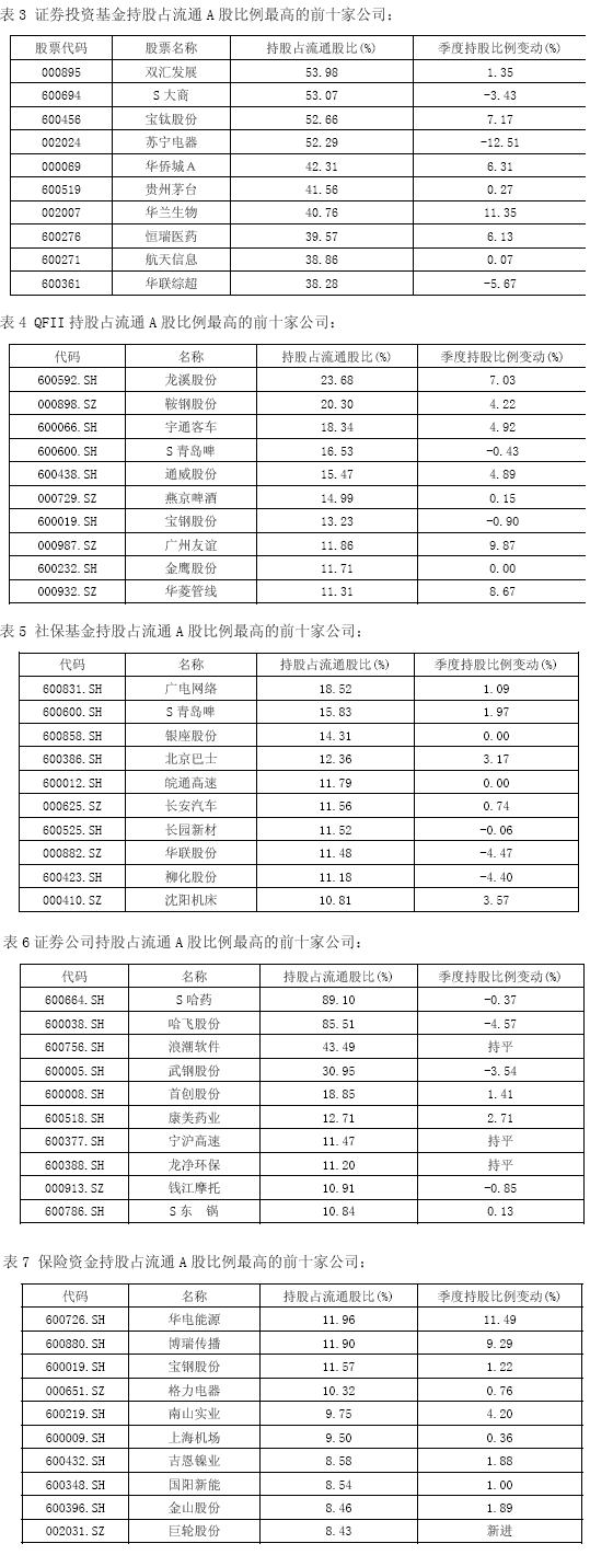在五类机构持股比例最高的前十只股票中,只有S青岛啤(被QFII、社保基金持有)、宝钢股份(被QFII、保险机构持有)两只股票重叠,各类机构投资者在个股方面维持分化的状况。