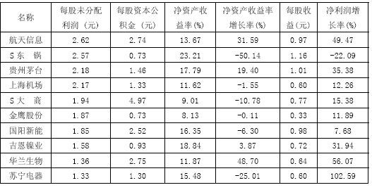 从分配能力上看,每股未分配利润在0.50元以上的有36家,最高的是航天信息的2.62元。每股资本公积金在1元以上的也有28家,最高的是S大商的4.97元。七成的公司具备高比例分配能力。每股未分配利润居前十名的公司见表8。