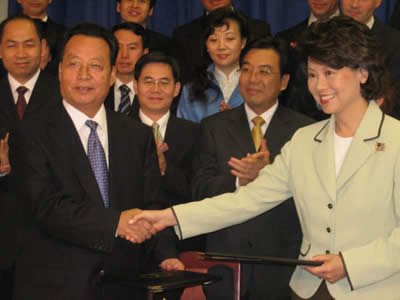 美国劳工部长赵小兰(右)在华盛顿与来访的中国劳动与社会保障部部长田成平(左)签署关于中美两国劳动合作的联合声明。唐勇摄