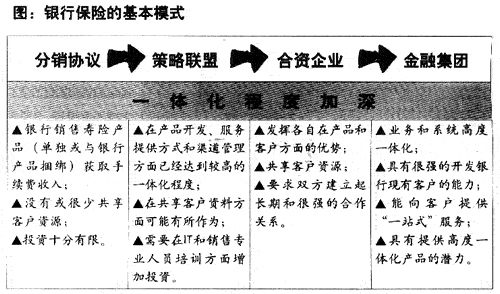 (三)银行保险将趋于深度合作。巨额存差有望成为我国银行保险由现行的代理销售模式走向更为深度的合作。巨额存差带给商业银行的经营压力,促使商业银行不再仅仅满足于代理保单销售,而将市场拓展的着力点转向与保险公司合作共同开发潜在的客户,银行与保险公司的关系将由现在合作与竞争,但更多的是竞争,转向更多的合作。通过搭建共同的IT系统,对银行的客户资源进行深度利用:开发兼有银行和保险双重功能的金融产品,强化柜面人员的培训等方式推动银行保险趋于深度合作。