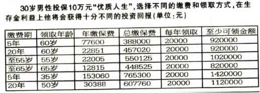 在“优质人生”的缴费期上,投保人既可以选择5年、10年、15年、20年的缴费期间,也可以选择从投保时一直缴费至55周岁、60周岁和65周岁。而 在决定领取的时间上,被保险人既可以选择在达到55周岁、60周岁和65周岁时开始领取,也可以在缴费期满后开始;在领取的方式上,既可以选择每三年一领,也可以每年一领,每次可领取保额的20%。这样一来,“优质人生”就有多达7种缴费方式和11种领取方式可供选择。在相同性别、相同投保年龄和相同保 额的条件下,选择不同的缴费和领取方式,就会产生不同的年缴保费、保费总额、领取时间以及保险公司至少可以给付总金额。