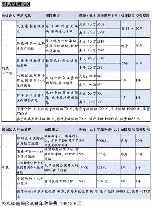 专家点评:家庭保险套餐首重主要收入者的保障,因为一旦主要收入者收入中断,全家的经济马上出问题。在保险规划中,应先从收入者的保障入手,当终身型险种超预算,再通过适当的定期险及意外险来提高保障;其次才考虑小孩的医疗,再来准备教育金。[NextPage]